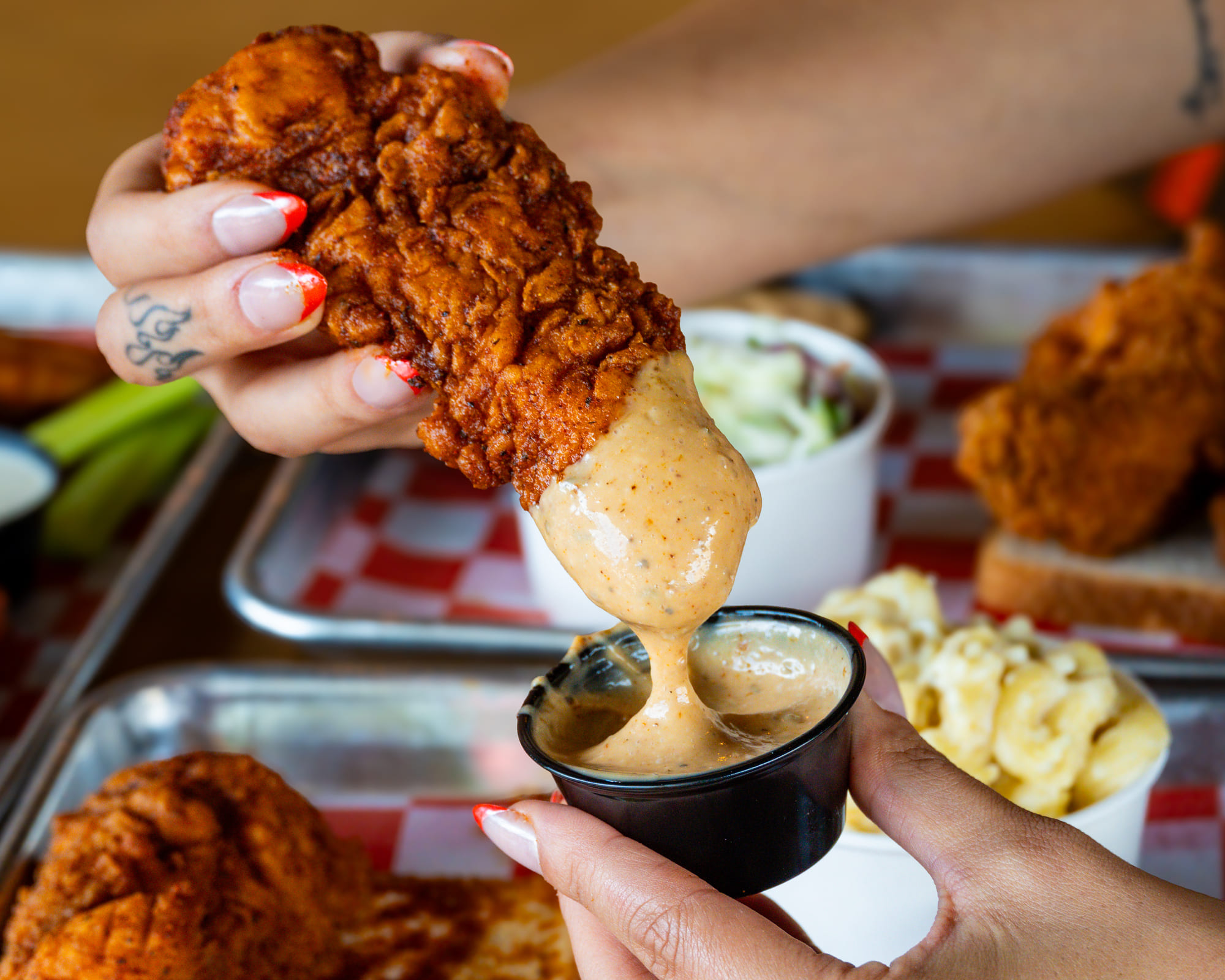 We’re all about bold, saucy, no-apologies hot chicken from jumbo tenders and crispy wings to stacked sandwiches that bring the heat.